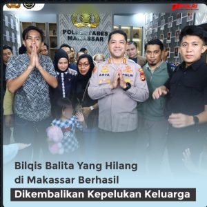 Rilisberita.id,jakarta– Polri berhasil menemukan dan memulangkan Bilqis (4), balita yang sempat dilaporkan hilang di Taman Pakui Sayang, Jalan A.P. Pettarani, Makassar, pada Minggu (2/11/25) Keberhasilan ini merupakan hasil kerja cepat dan kolaboratif tim Jatanras Polrestabes Makassar bersama Polsek Panakkukang. Setelah dilakukan penyelidikan intensif dan analisis rekaman CCTV, petugas akhirnya berhasil menemukan Bilqis di Kabupaten Merangin, Provinsi Jambi, pada Sabtu (8/11/25) Setibanya di Makassar Bilqis langsung diserahkan kepada orang tuanya pada Minggu (9/11).
