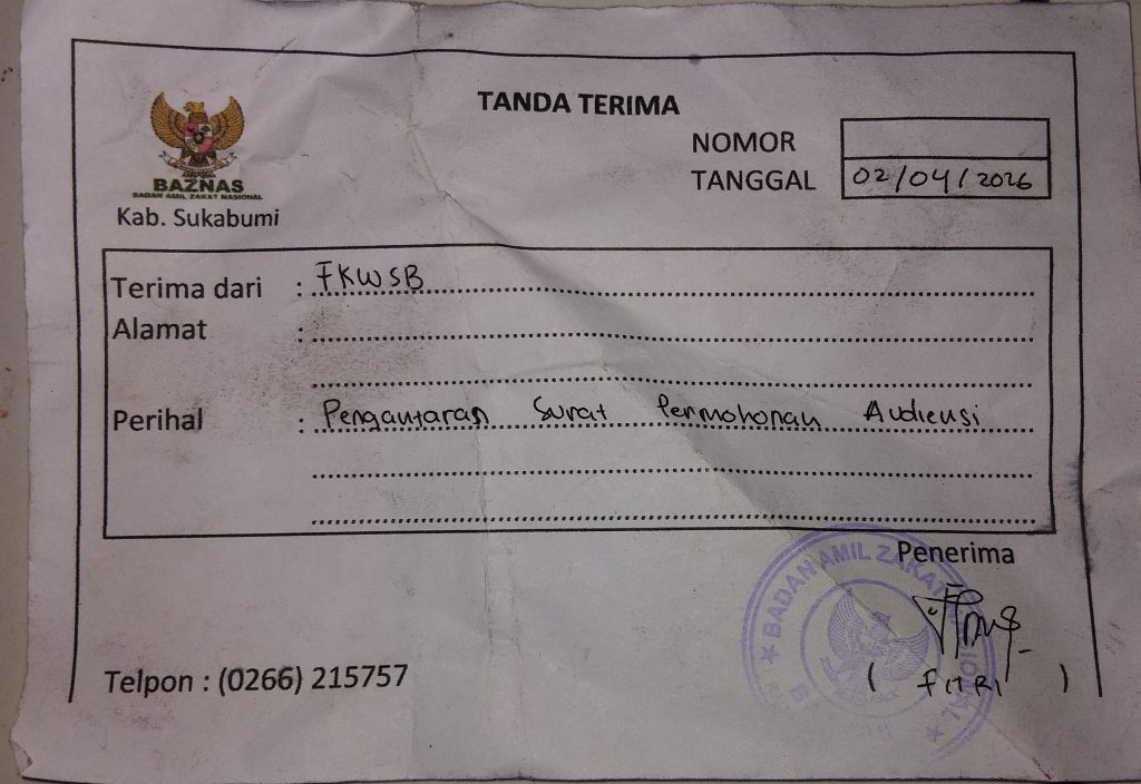 ” kita forum komunitas wartawan Sukabumi Bersatu telah memberikan Surat Permohonan Audensi Atau Rapat dengar Pendapat yang di tujukan kepada Badan Amil zakat Nasional (Baznas) Kabupaten Sukabumi, belum lama ini”, terang Rd.Hadi haryono ketua umum FKWSB .